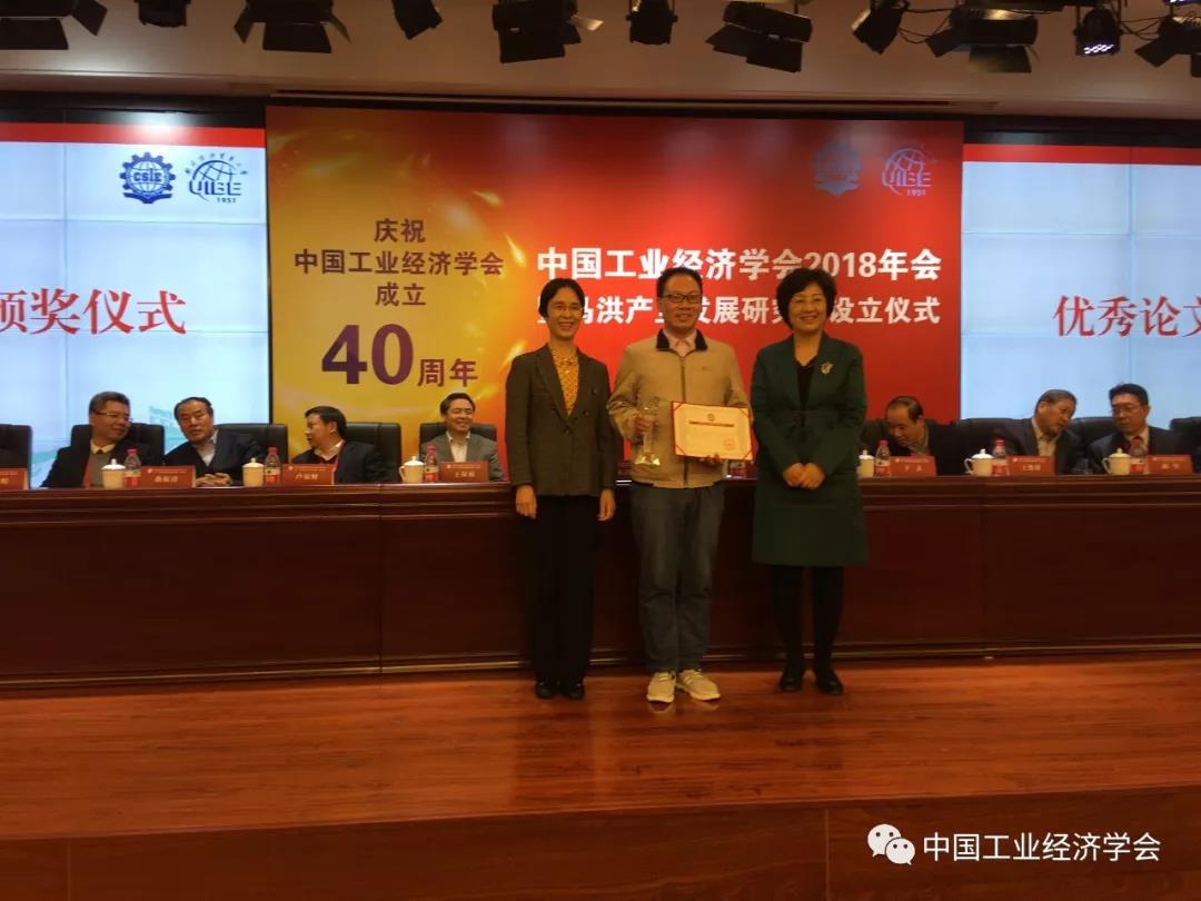 大会共收到论文投稿268篇,入选会议28篇,共评出获奖论文6篇,其中一等奖1篇、二等奖2篇、三等奖3篇。第十三届全国人大常委、社会建设委员会副主任委员、国务院原副秘书长江小涓研究员公布了本届年会获优秀论文的作者名单。西安交通大学经金学院产业经济学专业博士生徐远华的论文《中国工业加速创新的新机制——基于人力资本分工与协同的研究视角》荣获唯一的一等奖。江小涓研究员和史丹研究员共同为徐远华博士颁发获奖证书和奖杯,并合影留念。