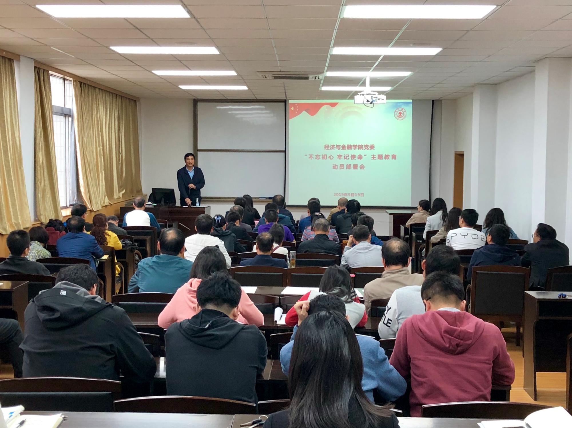 9月19日下午,经济与金融学院党委在财经主楼802报告厅召开“不忘初心、牢记使命”主题教育动员部署会。学院领导班子、教工党员、学生党员代表共计70余人参加会议。主题教育第十指导组联系常委张定红、成员吴孟秋、罗娴出席会议。会议由宋丽颖书记主持。
