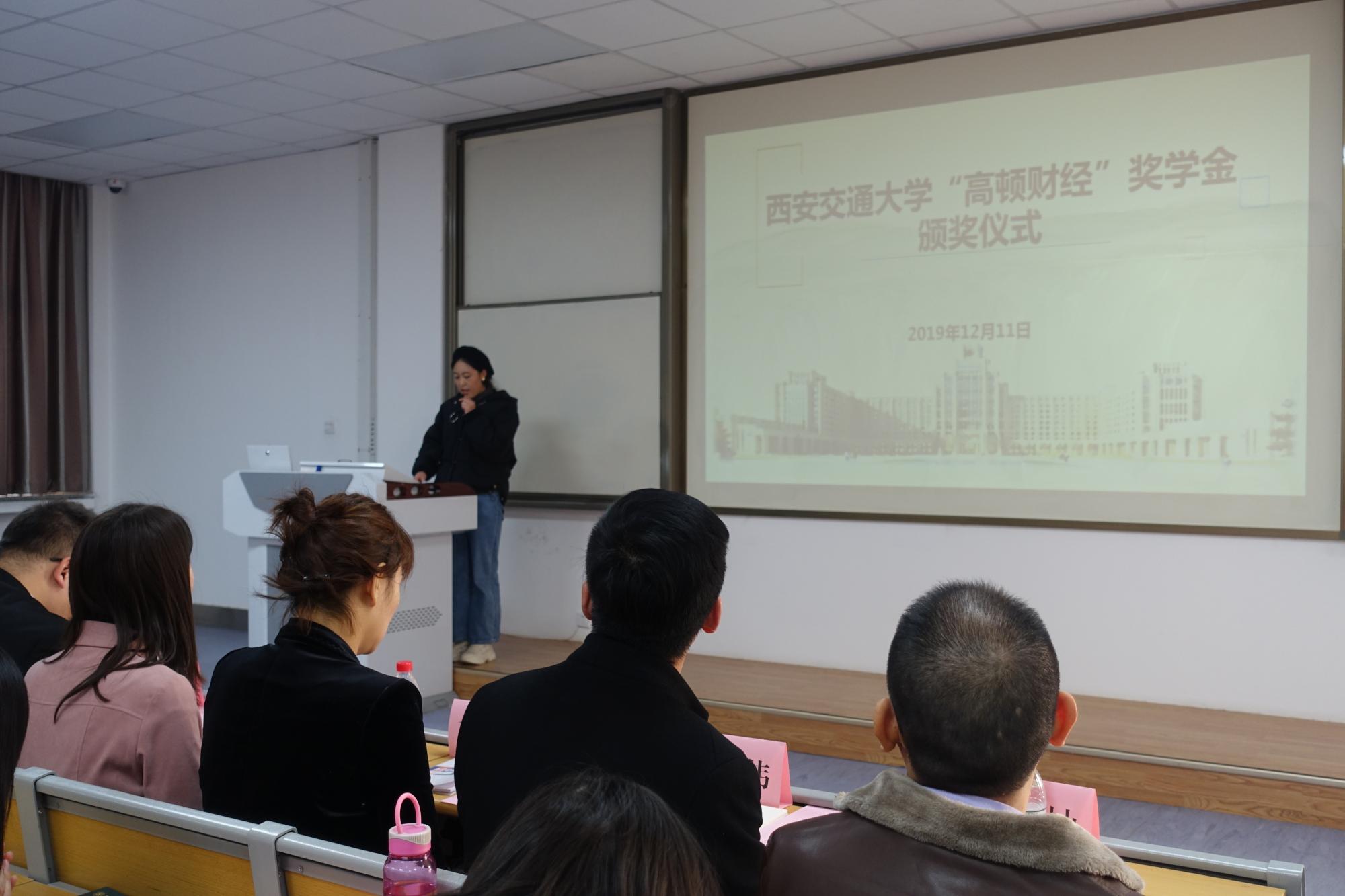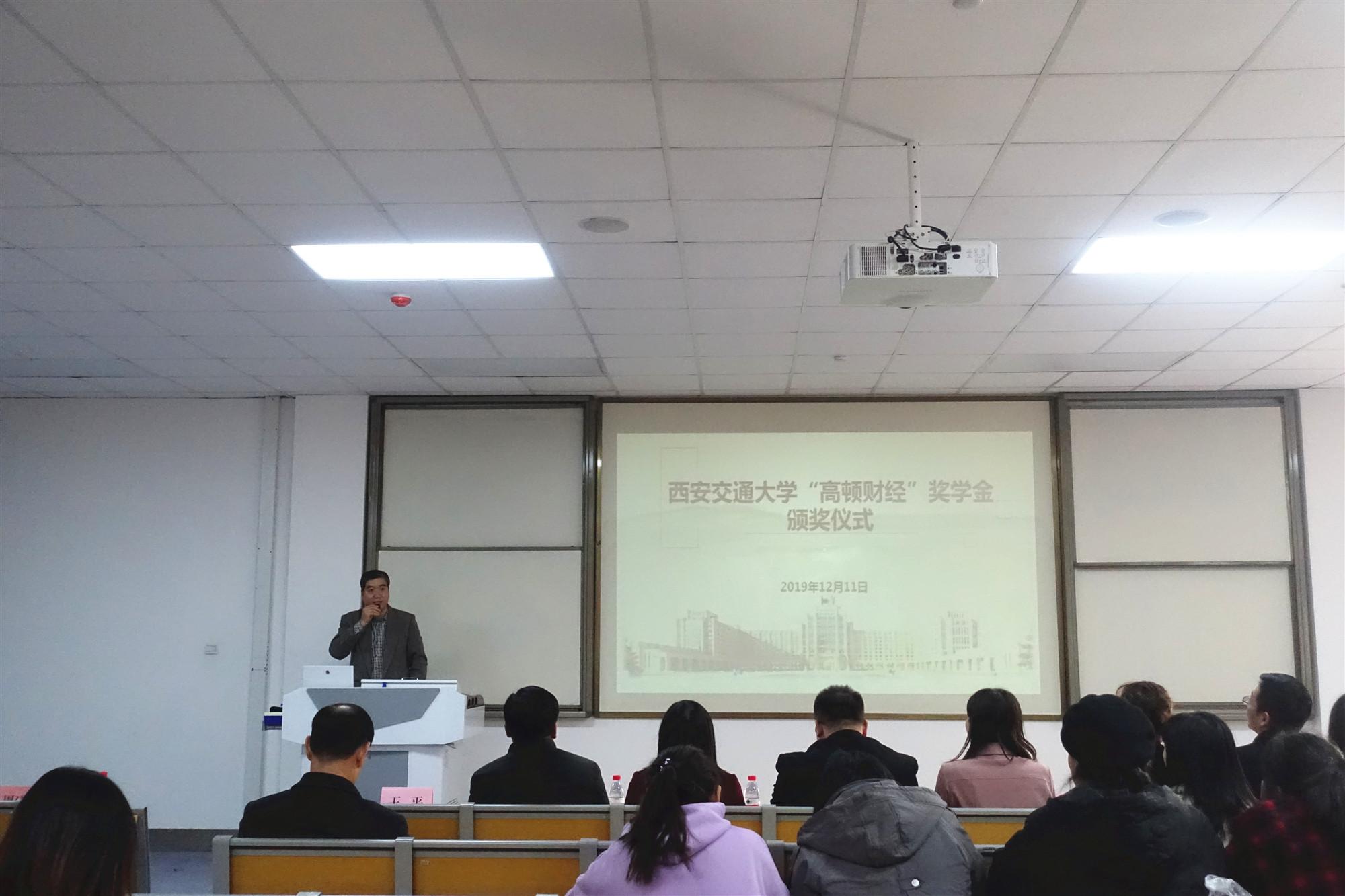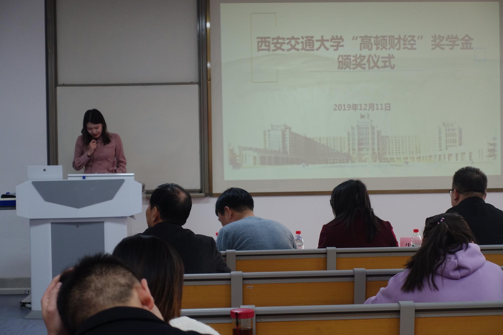 12月11日下午,2019年西安交通大学 “高顿财经”奖学金颁奖仪式在财经东配二楼举行。高顿教育集团领导、经金学院、启德书院和宗濂书院领导以及辅导员老师出席仪式,并为在名企实习、国际名校研学、大学生创业、社会实践四方面表现突出的11位同学以及5个团队给予表彰奖励。颁奖仪式由经金学院周建伦副书记主持。