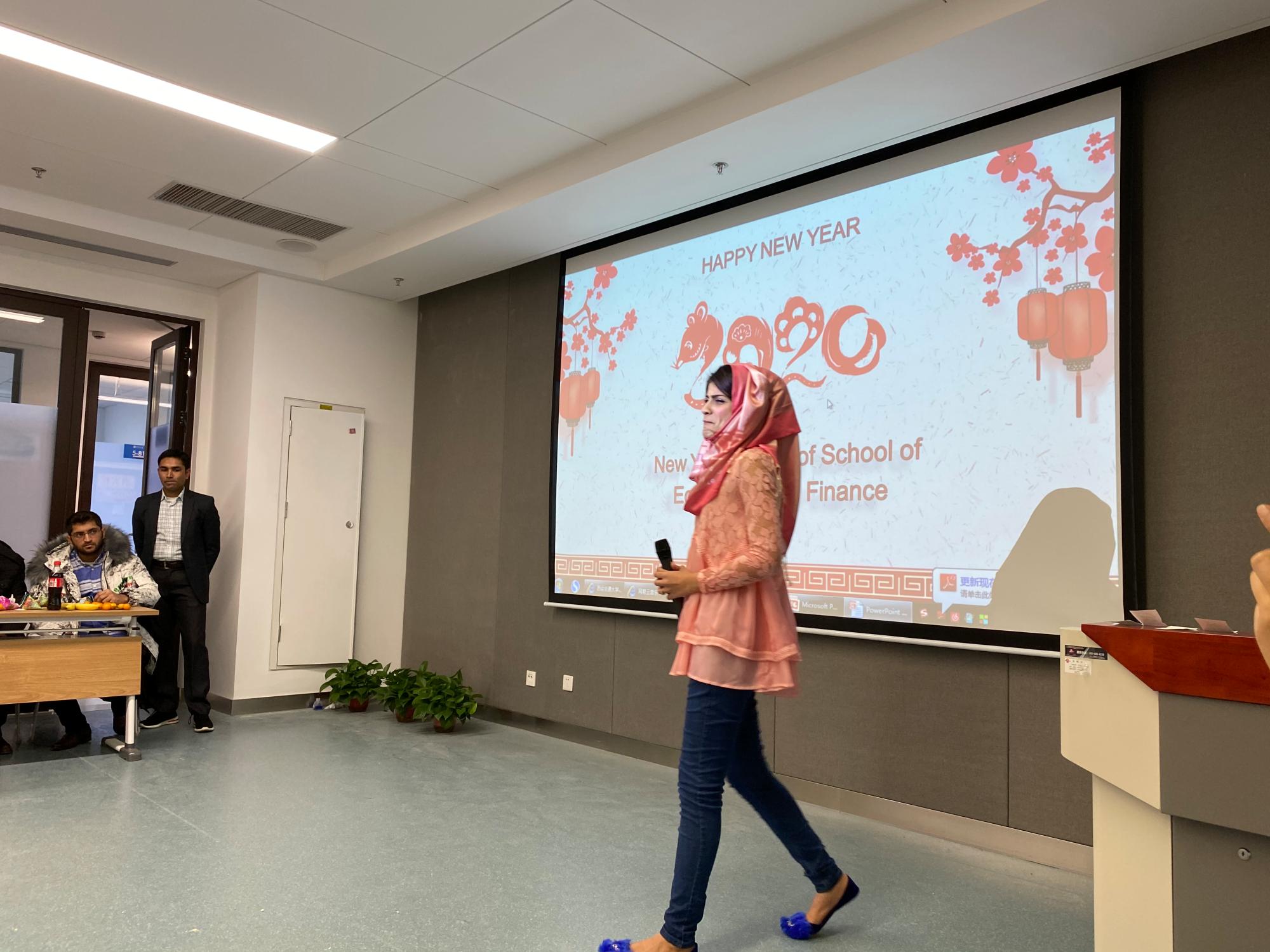 联欢会伊始,经金学院副院长温军致开幕词,表达了对留学生的殷切期望和新年祝福,希望他们在新的一年专注科研学习,加强对中国的了解与认识,成长为“爱华、亲华”人才。国际教育学院纪婷副院长致词,表达了对同学们新年的祝福和问候。两位优秀留学生代表MUSA UMAR、HAMID MAHMOOD向新生分享了他们的学习历程和科研心得。