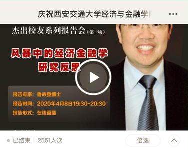 2020年4月8日19:30-21:00,西安交通大学经济与金融学院杰出校友、兴业银行首席经济学家、华福证券首席经济学家、中国首席经济学家论坛理事、中国金融四十人论坛(CF40)特邀成员鲁政委博士,应邀以在线直播方式,在云端为庆祝母校华诞分享了一堂题为《风暴中的经济金融研究反思》的高水平学术报告。本场报告是庆祝西安交通大学经济与金融学院建院二十周年暨西安交通大学财经教育成立九十周年杰出校友系列线上活动的首场报告会,取得了广泛热烈的社会影响,吸引了2300余人同步在线观看。