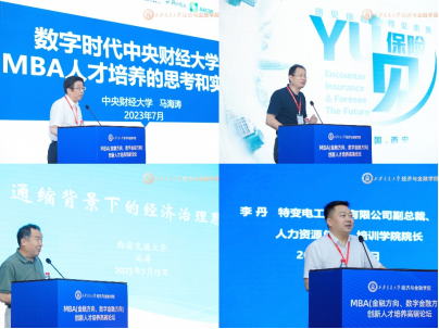 中央财经大学校长马海涛教授、特变电工股份有限公司副总裁李丹、中国人民财产保险公司陕西分公司总经理桂文东以及西安交通大学冯涛教授先后进行了主旨演讲。马海涛教授从中央财大MBA项目的发展历程、数字时代MBA教育面临的挑战、MBA项目的发展趋势等方面进行精彩分享,提出了“产业+商学”MBA教育人才培养的新模式和新路径。桂文东总经理发表了“遇见保险、预见未来”的主题演讲,他表示数字经济已成为重塑全球经济结构的关键力量,潜在风险也暗流涌动,保险业要顺应新形势,为高质量发展保驾护航。李丹副总裁以“构建可持续发展的人才战略”为主题进行了分享,他围绕“选对人保障一流事业、育好人促进企业发展、用对人提升组织绩效、留住人激发组织活力”等四个方面介绍了特变电工人才战略管理实践。冯涛教授带来“通缩背景下的经济治理思考”的主题演讲,他分享了对潜在增长空间及经济政策的最新思考,提出了“一核两翼模式”的经济发展布局构想。