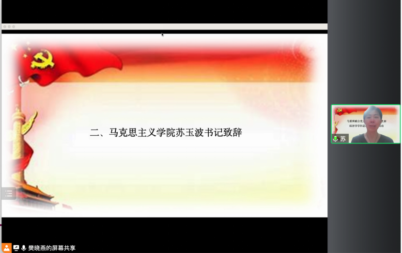 马克思主义学院党委书记苏玉波同志致辞,她强调了跨学科支部建设共建和交流的必要性,肯定了本次活动的重要意义。两位支部书记互相介绍了各自支部的组织构成和参会人员的基本情况。