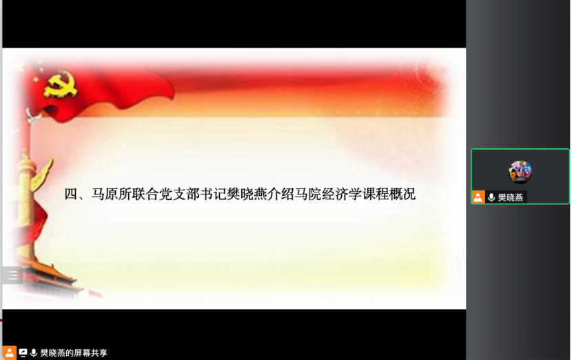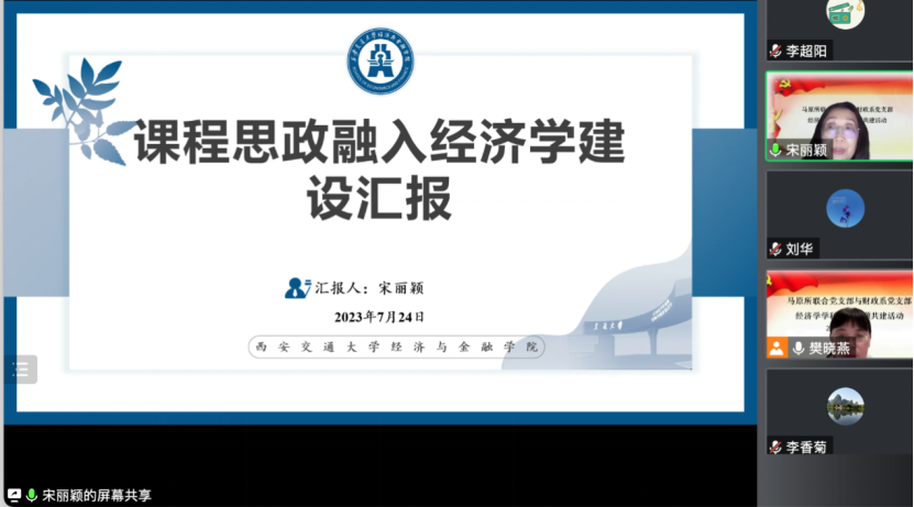 为了进一步深化主题教育的成果,更好地加强专业学院和马克思主义学院的交流,促进学科思政建设和大思政格局的构建。2023年7月24日上午,经济与金融学院财政系党支部和马克思主义学院马原所联合党支部在线上举行经济学学科思政主题共建活动。马克思主义学院党委书记苏玉波、马原所联合党支部、财政系党支部全体党员和教师参加会议,马原所联合党支部书记樊晓燕主持会议。