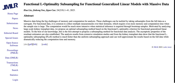 近日,上述研究成果以《大规模函数型广义回归模型下的最优抽样方法FLoS》(Functional L-Optimality Subsampling for Functional Generalized Linear Models with Massive Data)为题发表在机器学习和人工智能领域国际顶级期刊Journal of Machine Learning Research(简称JMLR)上。刘华是第一作者,西安交通大学经济与金融学院是第一署名单位。JMLR由麻省理工学院出版社(MIT Press)出版,依托于麻省理工学院的计算机科学与人工智能实验室(MIT CSAIL: MIT Computer Science & Artificial Intelligence Lab) 是国际上公认的计算机领域顶级期刊之一,主要刊登机器学习与人工智能领域的高质量前沿研究成果。