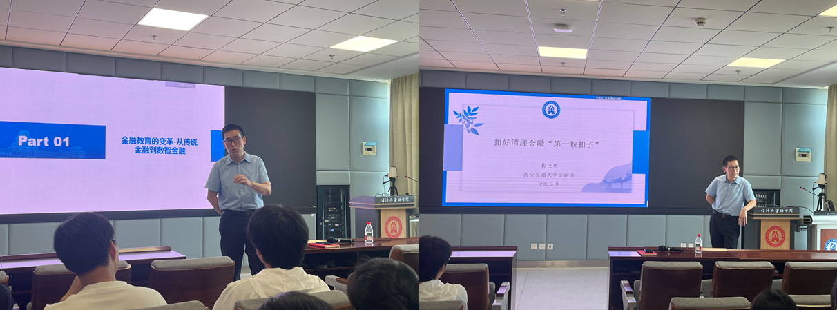 见面会之后,金融系主任程茂勇教授带来了“扣好清廉金融‘第一粒扣子’”专题课。他从“金融教育的变革” “数智金融背景下清廉金融内涵” “西安交通大学清廉金融的教育实践”三个方面与2025级研究生进行分享,基于数据视角、技术视角、金融视角三个维度阐释了数智金融背景下清廉金融的深层次内涵,强调真正的金融人不是财富的奴隶,而是价值的守护者,并希望同学们在未来的金融实践中要坚守“三不”底线——不碰合规红线、不越道德雷池、不做欲望俘虏。