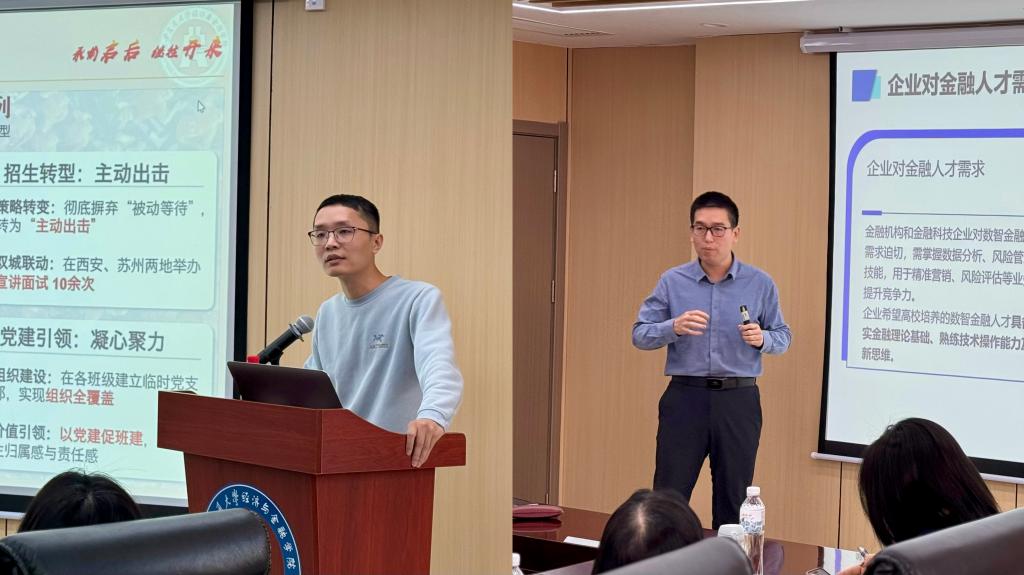 会议伊始,院长助理李江龙代表学院作主题汇报,系统回顾了学院在“十四五”期间于学科建设、人才培养、科学研究、社会服务等方面取得的显著成绩,深入剖析了当前面临的机遇与挑战,并重点汇报了“十五五”发展的总体思路、目标与重点任务。金融系主任程茂勇聚焦金融学科建设,详细汇报了学科进展、课程体系改革成效以及“数智实验班”的筹备情况,展现了金融学科顺应时代变革、锐意创新的积极探索。