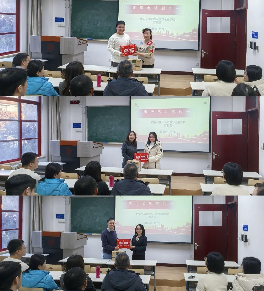 研讨会后,财政系还举行了青年教师慰问活动。王俊霞、宋丽颖、鄢哲明分别向财政系年轻教师程可为、陈甄妮、苏代钰发放了新年慰问品。王俊霞于冬日时节为青年教师们送上暖心关怀,她表示,系里始终关切各位青年教师,叮嘱大家在潜心教学、深耕科研之余,务必兼顾家庭生活、呵护身心健康,以更饱满的精神状态投入到工作与生活中。