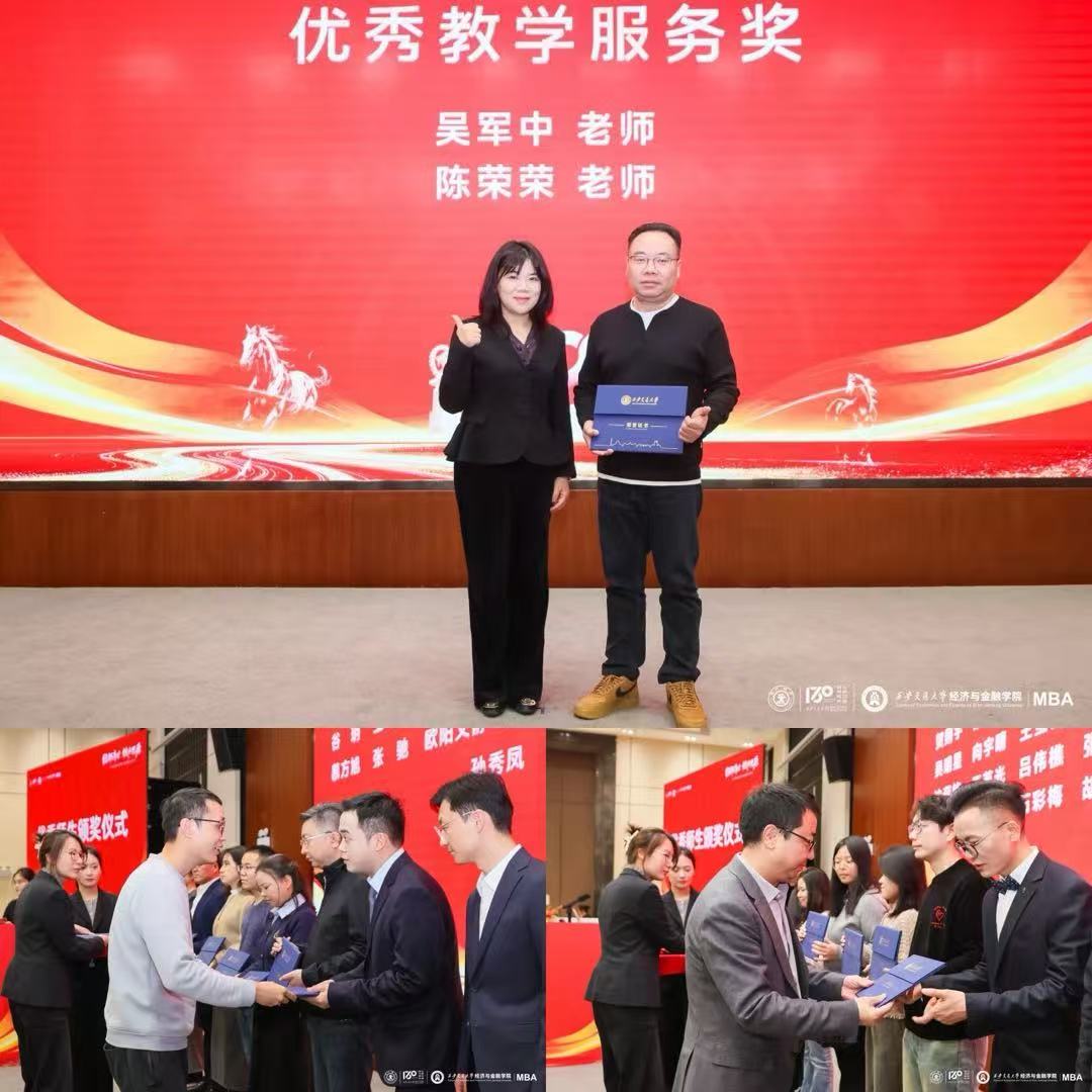 星空不问赶路人,岁月不负有心人。在热烈的气氛中,经济与金融学院党委副书记刘小溪、西安交通大学就业创业指导服务中心副主任兼经济与金融学院院长助理李江龙、经济与金融学院院长助理兼MBA中心主任马草原,分别登台为2025年度“优秀教学服务奖”获奖教师、“优秀研究生干部”及“优秀研究生”获奖学生颁发荣誉证书。聚光灯下的荣誉,不仅是对师生们过去一年辛勤耕耘与卓越贡献的高度肯定,更是一种精神的传承与激励,感召着每一位经金人以此为标杆,砥砺前行。