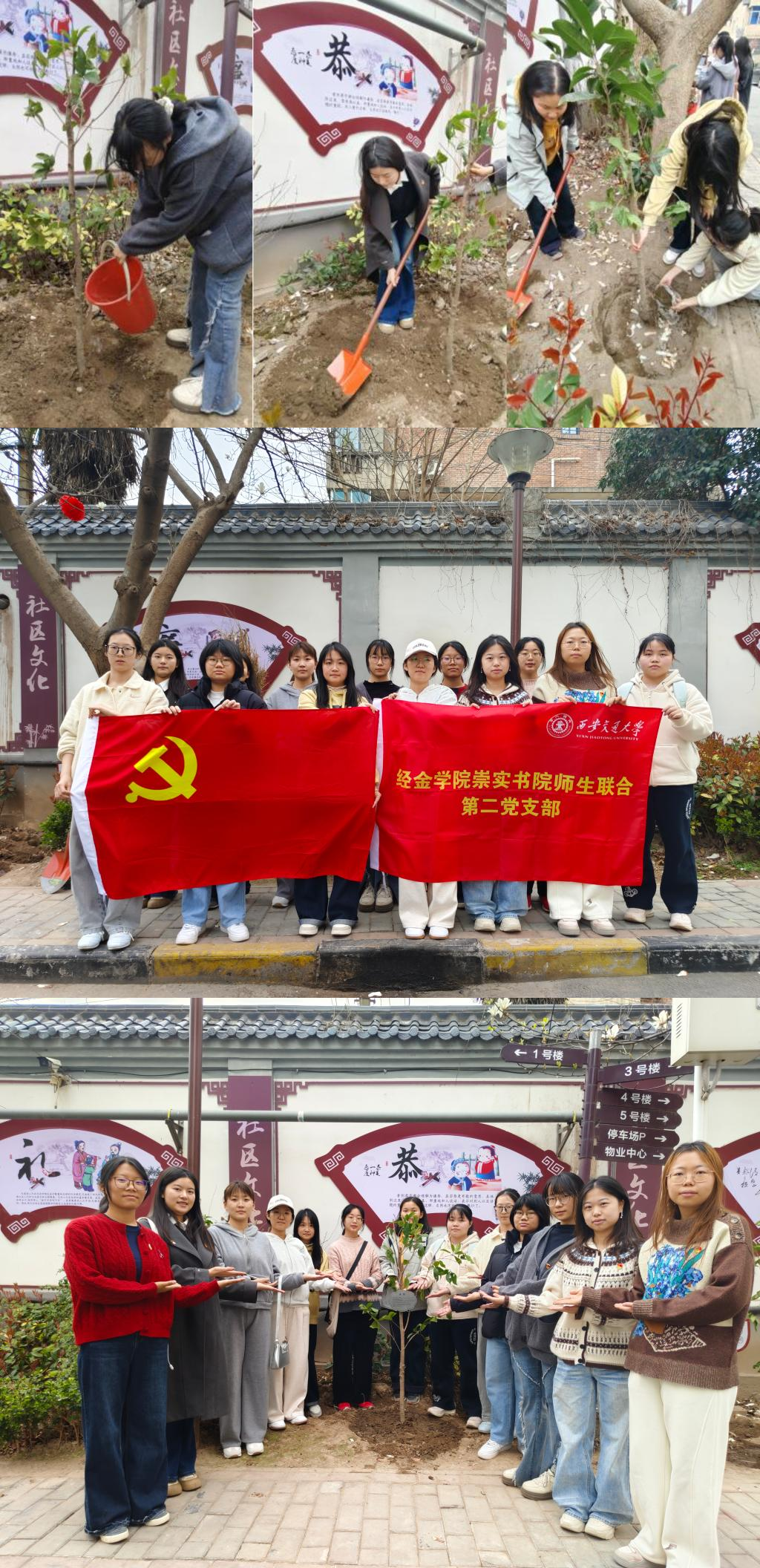 3月12日,碑林区太乙路街道建东街社区党委、经金学院崇实书院师生联合第二党支部、经金学院硕5194班党支部以及化工学院2024级化机硕士生党支部共同开展“春风拂枝植新绿,同心携手护家园”植树节主题党日活动。建东街社区党委书记杨昕、经金学院崇实书院师生联合第二党支部学院指导老师鄢哲明、经金学院崇实书院师生联合第二党支部书院指导老师刘凯参加活动。