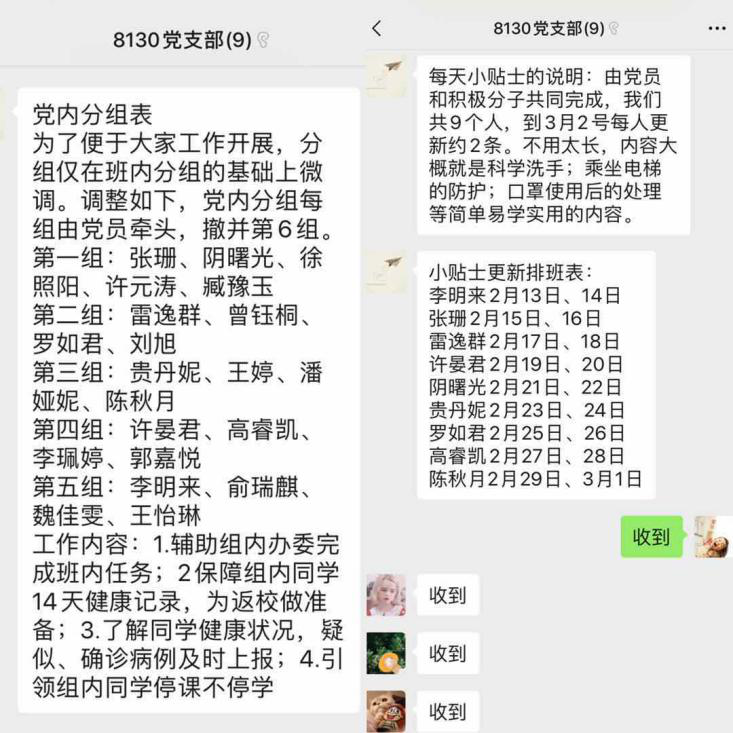之后根据会议上的工作安排,党支部成员积极开展了以下工作:一是支部党员积极认领班级防控“责任田”,及时了解班级同学健康状况;二是党员和积极分子每日更新防控“小贴士”,有效帮助同学科学防控;三是通过多样方式贡献自己力量,为武汉加油。