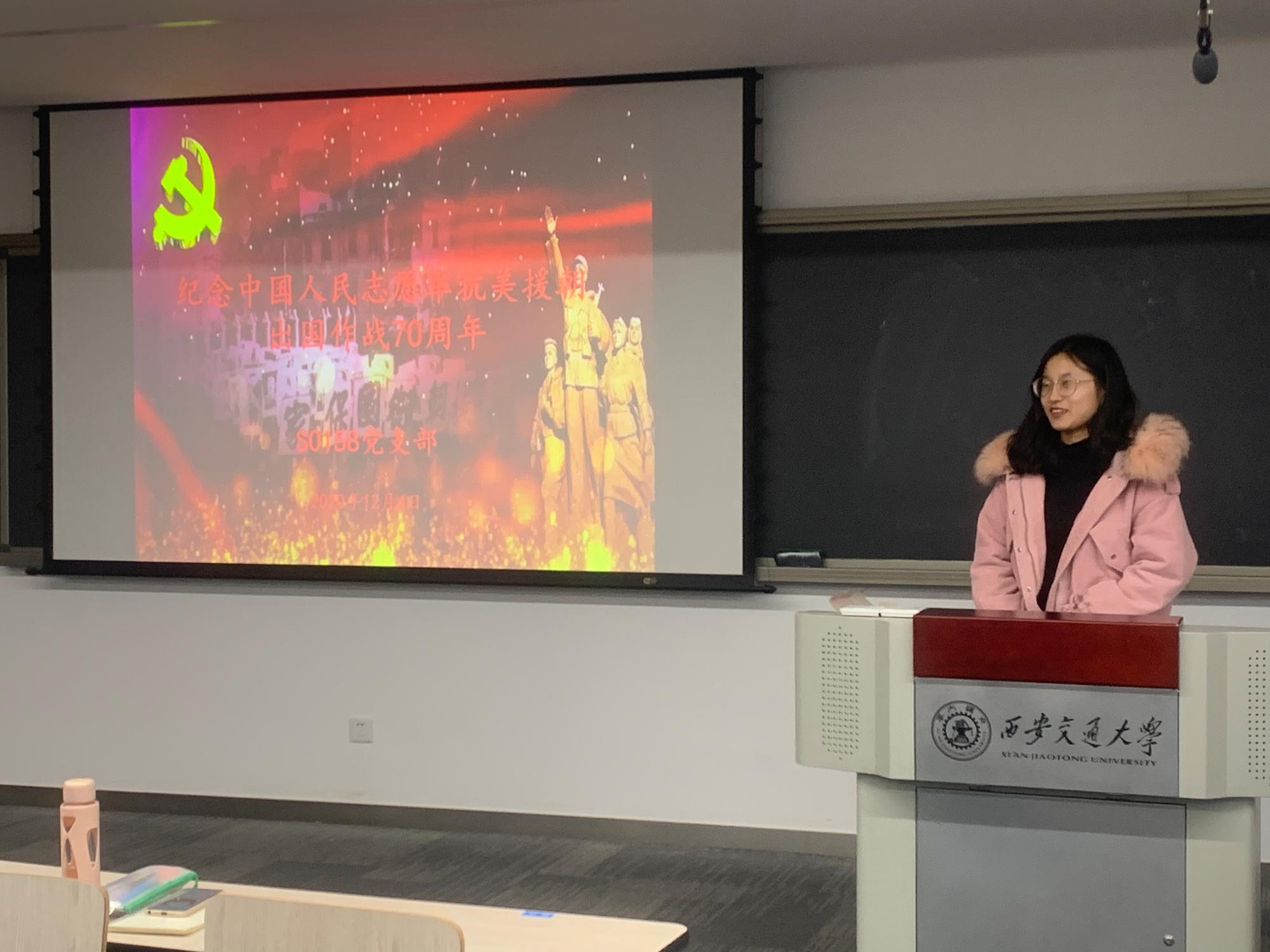 今年是中国人民志愿军抗美援朝出国作战70周年,为致敬不畏强敌、不负重托的革命英雄,S0158党支部在12月4日召开以“继承和弘扬伟大的抗美援朝精神”为主题的的党日活动。全体党员及积极分子一同观看了纪念中国人民志愿军抗美援朝出国作战70周年大会,并学习了习近平总书记在会上的重要讲话。观看之后,各位党员和积极分子们交流了学习感想。