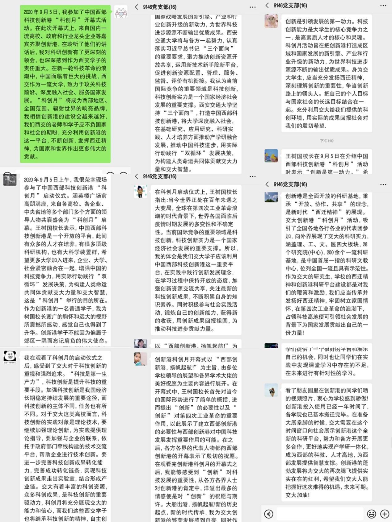 接着,全体党员开始展开热烈讨论,积极畅谈个人的心得体会。支部成员郭薛南发言道:中国西部科技创新港,将大学深度融入社会,推动产学研融合发展,推动中国科技进步,用实际行动践行“双循环”发展决策,为构建人类命运共同体贡献交大力量和交大智慧。柯智健表示:科创月活动旨在把创新港打造成区域和国家发展的新引擎、产业和行业升级的新动力,为世界科技进步源源不断的输出优质成果。身为交大学生,应当充分发扬西迁精神,深刻理解创新的重要性,争当创新路上的领头人。白露表示:在中美局势紧张,全球经济下行,我国两个一百年的紧要关头,科技力量深刻的影响着世界格局的走向。科技承载着实现中华民族伟大复兴的美好愿望,希望我们交大人能把握好这次难得的机遇,未来可期。