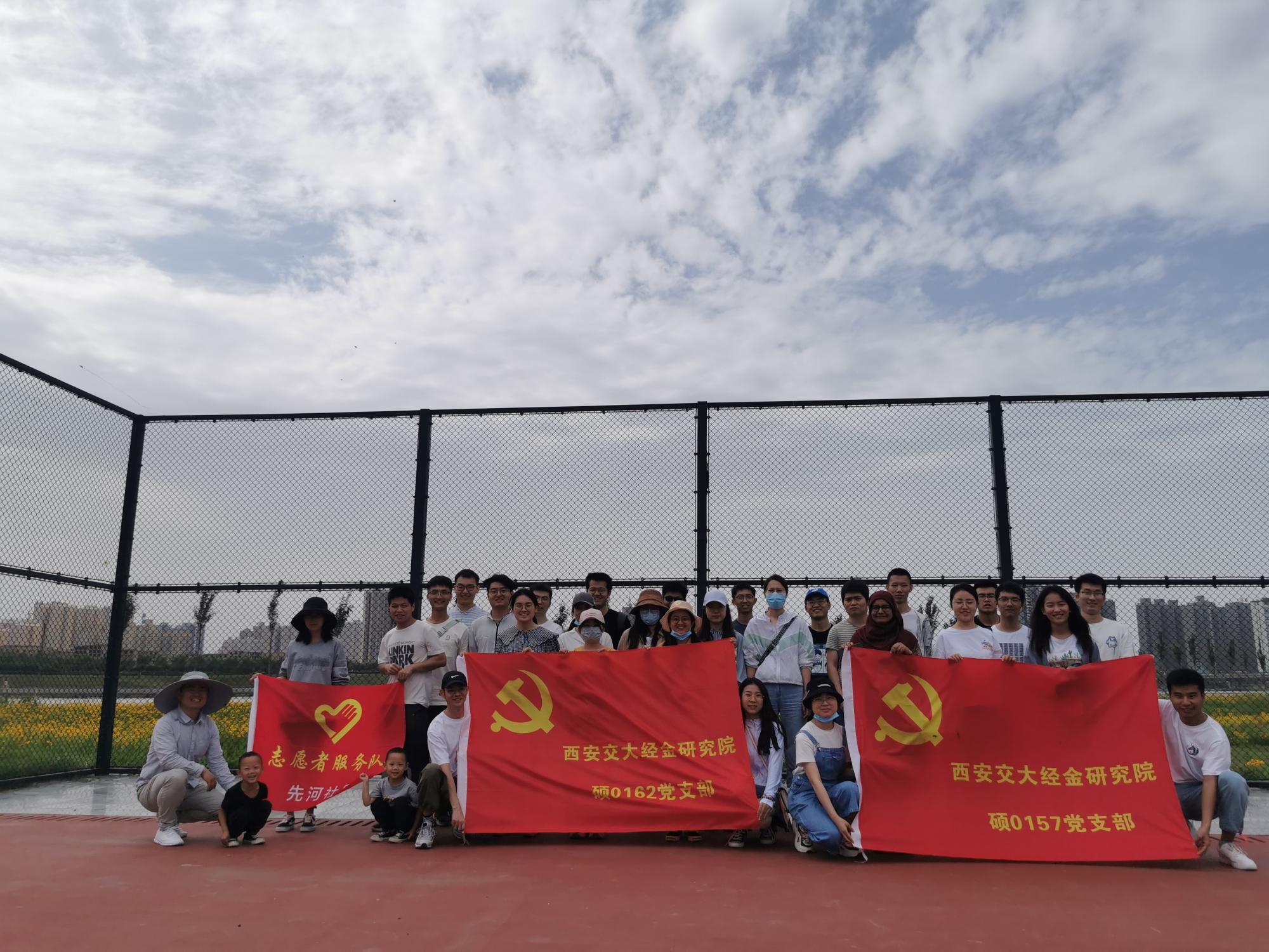 为将习近平总书记“绿水青山就是金山银山”的发展理念进一步融入青年群体的生活实践中,不断提高同学们的劳动积极性并增强其环保意识。5月23日下午,经金学院硕0162、0156、0157党支部组织30名同学联合开展了第二期“渭河净、仙交情”公益环保志愿活动,该活动得到了西咸新区陈阳寨街办安谷村党支部的大力支持。与第一期相比,现在的渭河边已是草长莺飞、鲜花烂漫。游客量增大,因此亟须通过环境清理来缓解渭河滨河湿地公园所面临的垃圾量激增的问题。