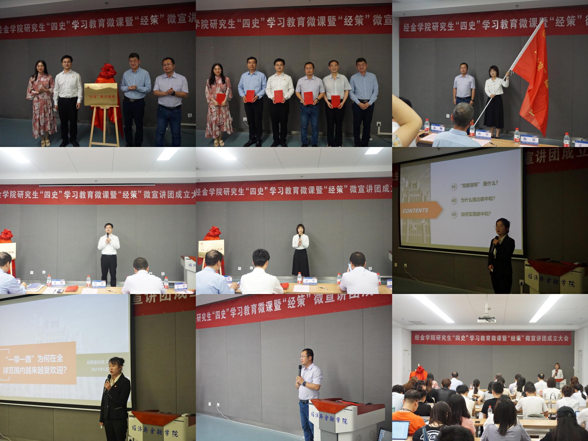 孙早院长和苏翔书记等共同为“经策”微宣讲团揭牌。陈晨老师为“经策”微宣讲团授旗,孙早院长为微宣讲团指导教师颁发聘书,王平老师为微宣讲团成员颁发聘书。
