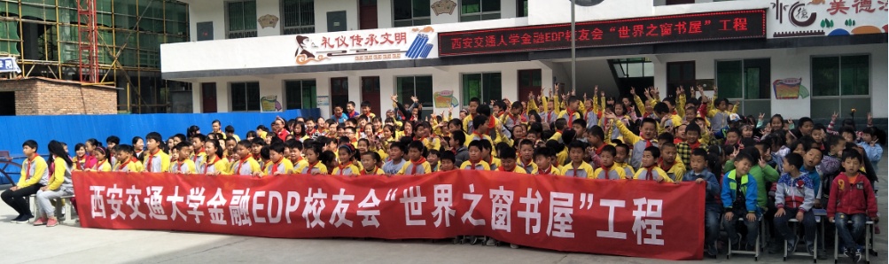 2017年4月21日,世界读书日到来之际,西安交通大学金融EDP校友会“世界之窗书屋”工程实施小组来到安康市平利县兴隆镇,开展“鲲鹏展翅飞,知识永相传——‘世界之窗书屋’公益活动”,给那里的孩子们送上书籍与书架,让书香的韵味熏染孩子们的心灵,用精神的力量鼓舞孩子们从小养成热爱阅读的良好习惯。