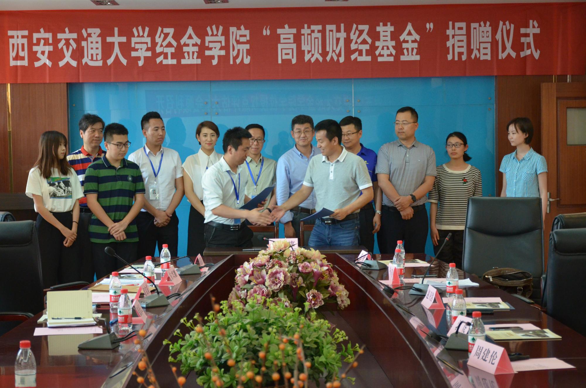 5月18日下午,西安交通大学高顿财经基金(奖学金)捐赠仪式在经济与金融学院举行。高顿财经领导、校基金会秘书长赵卫滨、经金学院院长孙早、启德书院院务主任郭虎、宗濂书院院务副主任陈勇和经金学院研究生和本科生代表参加。捐赠仪式由经金学院周建伦副书记主持。
