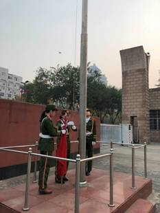 7点30分,升旗仪式正式开始,升旗手正在做最后的准备工作。迎着朝阳,国旗护卫队成员迈着铿锵的步伐来到了国旗台下,全场一片肃静。在激昂的《义勇军进行曲》中,护旗手振臂一挥,鲜艳的五星红旗随风展开,升旗手随之将五星红旗徐徐升起,五星红旗在晨曦中迎风飘扬在旗杆顶端。