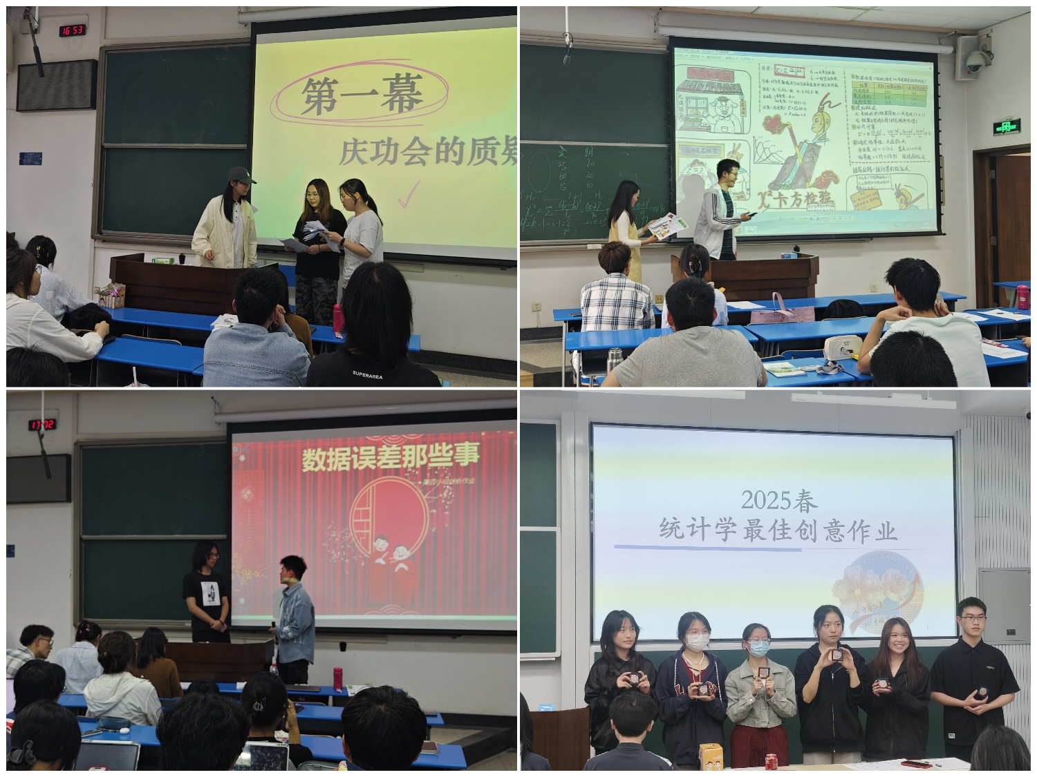以OBE理念为指导,《统计学》课程坚持“反向设计、成果导向、持续改进”,构建全过程、多场景、复合式育人路径,逐步形成四大特色:一是优化教学内容,科学设计低阶与高阶知识目标,突出问题提炼与实战分析能力,服务创新型人才培养;二是坚持立德树人,将思政元素有机融入教学,通过统计学发展史回顾、社会热点引入与现实案例讲解,强化价值引领;三是创新教学模式,贯通第一课堂与第二课堂,灵活运用小组讨论、案例分析、体验式教学等手段,提升学生的学习深度与思维广度;四是改革考核机制,在保留传统测试、学习笔记和期末闭卷考试基础上,引入富有创造性与实践性的过程性评价,如手抄报、情景剧、数据可视化、相声等多样化小组创意作业形式,激发学生表达能力与团队协作意识。