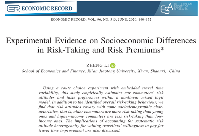 近日,西安交大经金学院李铮教授的学术论文—“Experimental Evidence on Socioeconomic Differences in Risk Taking and Risk Premiums”在经济学国际知名期刊《Economic Record》第96卷第313期上正式发表。