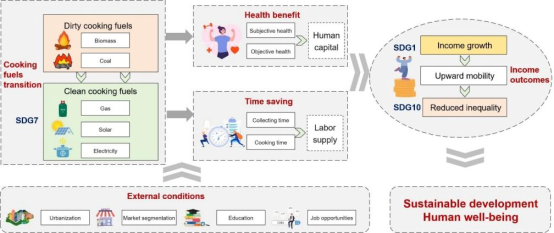 在国家自然科学基金项目等资助下,西安交通大学经济与金融学院李聪教授团队与香港城市大学、中国科学院及斯坦福大学合作者针对能源转型的收入分配效应开展研究,取得以下研究成果:推广清洁能源对于改善收入分配具有巨大潜力,有助于促进家庭收入增长和减少不平等。对于低收入群体来说,使用清洁能源带来的增收效应更大,推广清洁能源能够促进家庭收入向上流动,抑制家庭收入向下流动,从而优化收入分配格局。清洁能源的收入分配效应主要由人力资本提升和劳动供给改善驱动(图)。使用清洁能源可以降低肺病发病率,减少患慢性疾病的数量,提高健康水平,节约家庭医疗费用开支。此外,使用清洁能源可以节省燃料收集时间和烹饪时间,从而降低家务时长和增加劳动供给,提高工资收入。清洁能源转型具有良好的经济可行性。在推广清洁能源过程中,不同的能源转型路径会带来不同的公共和家庭成本,但推广清洁能源的总收益大于总成本。随着清洁能源的普及,预计到2030年我国家庭的收入与不平等现象将得到进一步改善。