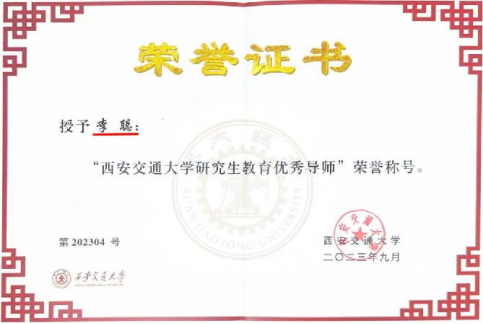 创新团队带头人李聪教授荣获“西安交通大学研究生教育优秀导师“称号。
