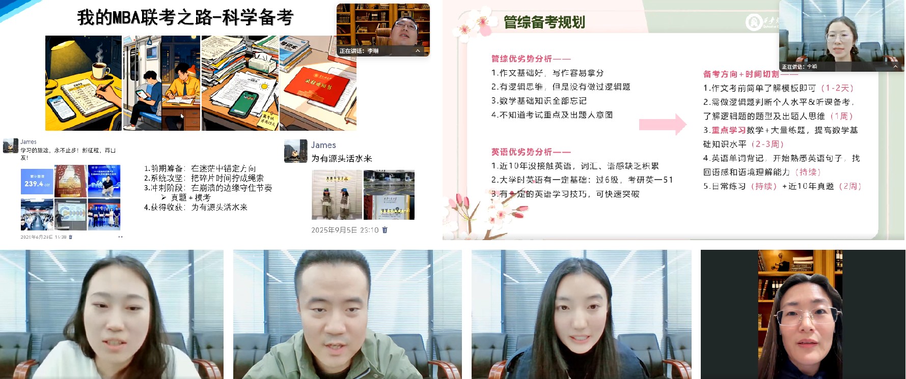 10月18日晚,在MBA全国联考备考进入关键冲刺阶段之际,西安交通大学金融MBA项目精心策划的“心有所向,一研为定——MBA联考经验分享会”于线上成功举办。本次活动旨在为紧张备考的2026级考生分享实战策略、解答冲刺疑惑。活动由经济与金融学院MBA中心马倩老师主持,近三小时的分享内容翔实、干货满满,吸引了众多有志报考西安交大金融MBA的考生热情参与,线上互动氛围热烈。
