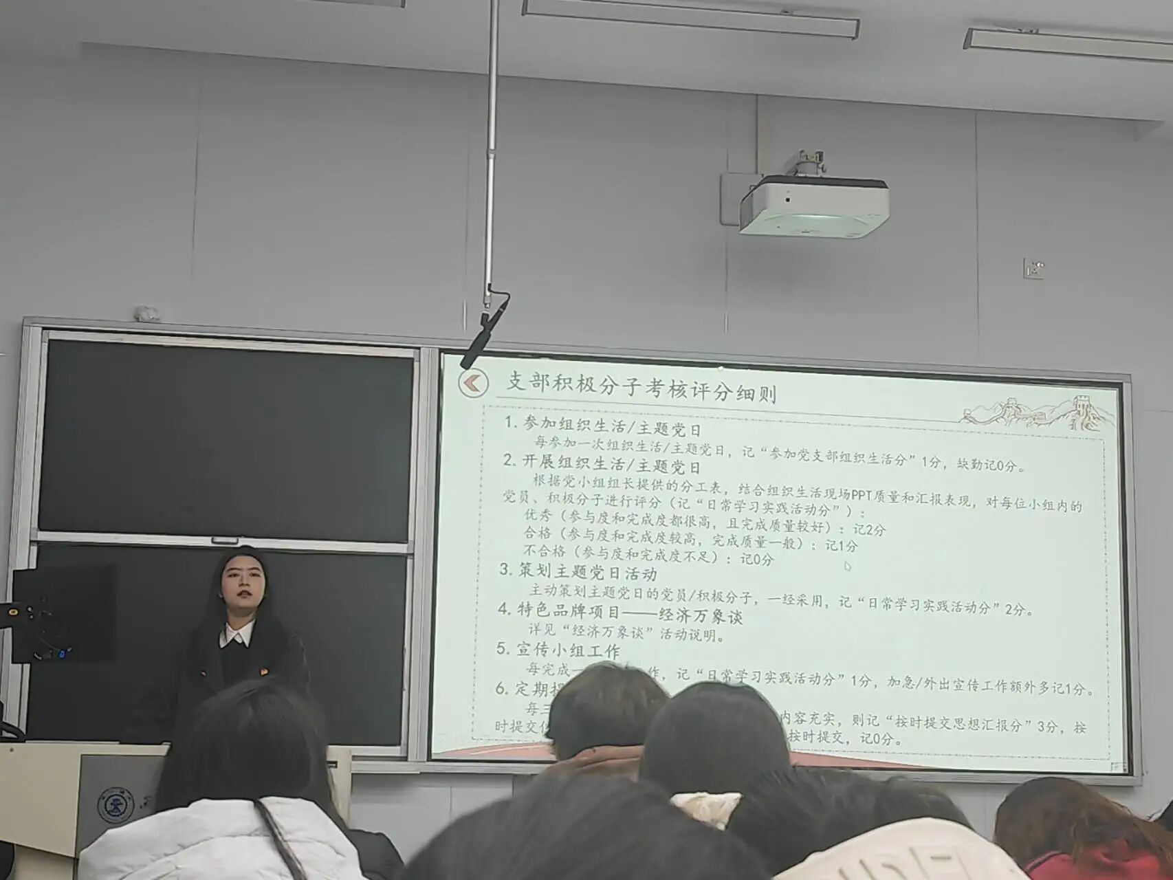 支部书记杨淳现场解读了《经金学院崇实书院师生联合第二党支部入党积极分子培养教育规定》。在《崇实书院入党积极分子量化考核内容及标准》的基础上,重点介绍了支部积极分子考核评分细则,详细说明“参加组织生活”“日常学习实践”“定期提交思想汇报”等量化评分标准,同时强调,量化评分是手段而非最终目标,希望大家不要唯分数论,要在日常学习生活中加强思想理论学习,规范自身行为举止,积极向党组织靠拢。