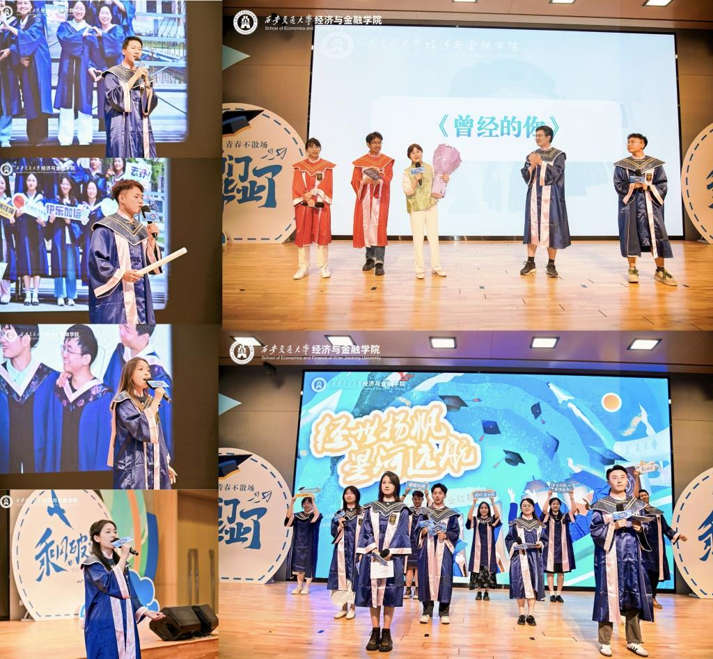 杨秀云教授团队师生同台演绎歌曲《曾经的你》,以悠扬旋律与深情告白,将师生间的深厚情谊娓娓道来。2025届毕业生们带来歌曲、朗诵节目《星河远航·致2025》,诉说着对师长同窗的感恩和对母校的眷恋,以“经邦济世,金融报国”的誓言展现经金学子作为西迁精神新传人的家国情怀。