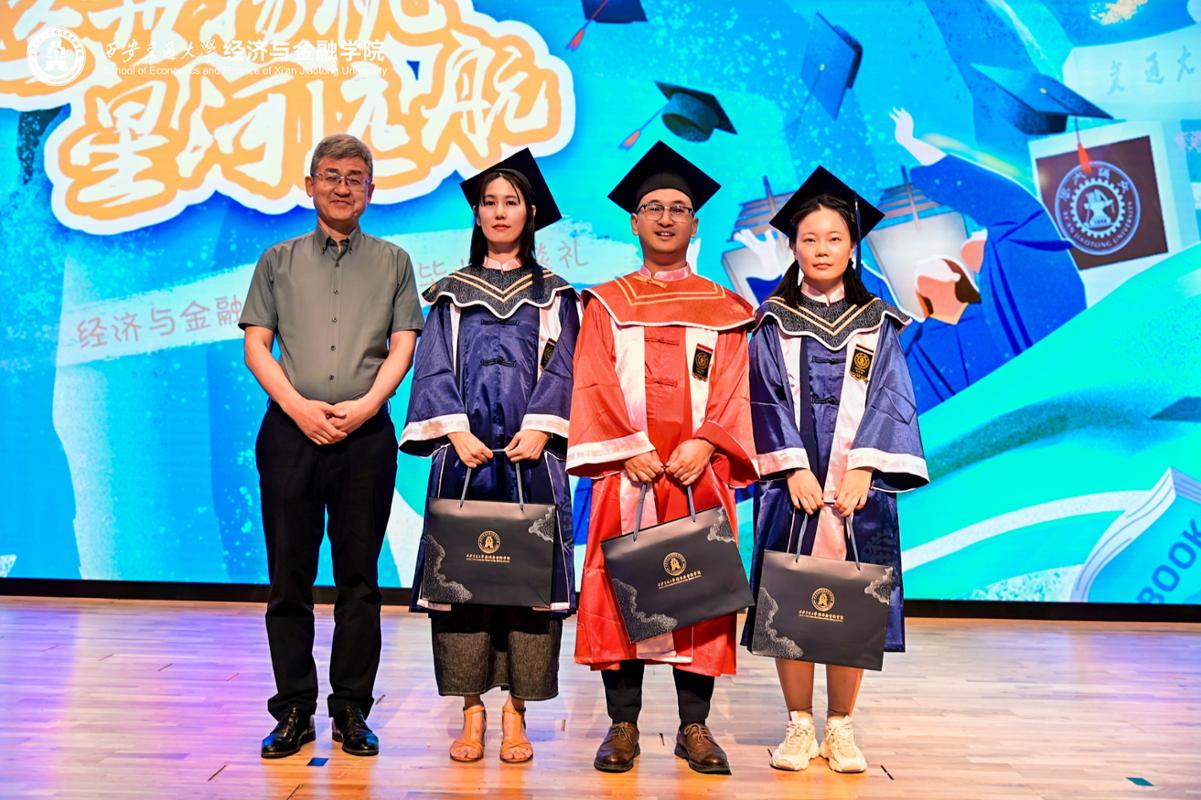 6月19日下午,经济与金融学院在新港报告厅举办2025届毕业红毯礼。校党委副书记、经金学院院长孙早,中国建设银行陕西省分行人力资源部副总经理王博华、科长田野、加涛,校党委研工部部长薛周利、校团委副书记石杨根出席;学院党委书记周建伦,副院长沈灏、温军、赵春艳,副书记刘小溪,学院各系教师、毕业生以及毕业生亲属参加。